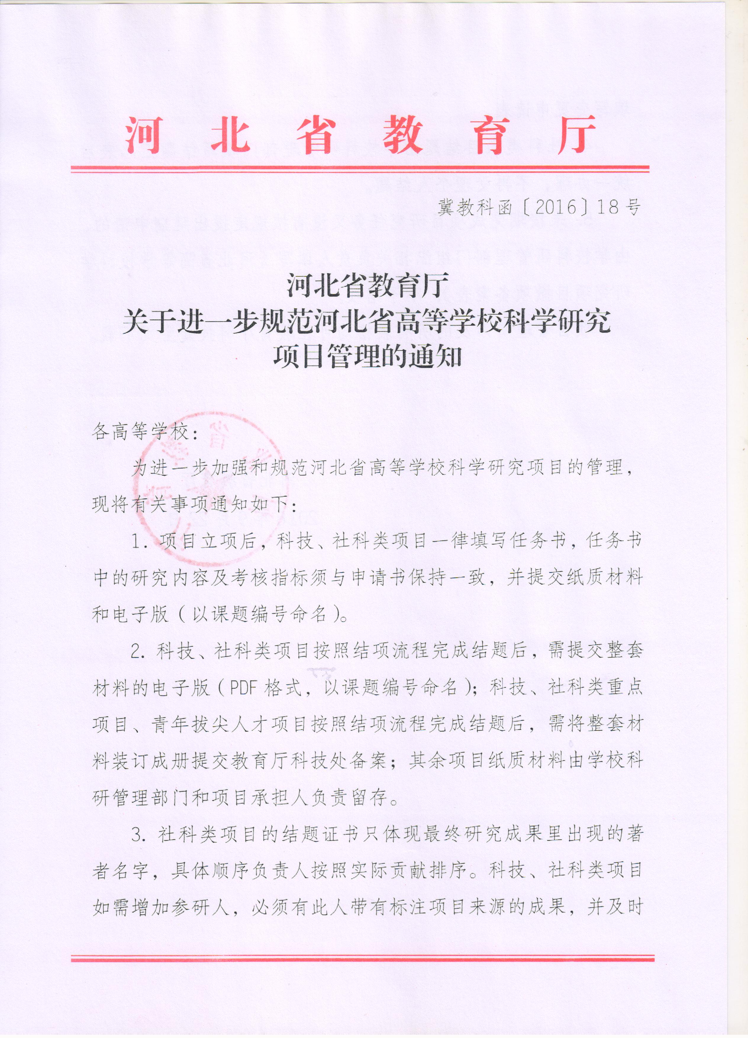 河北省教育厅关于进一步规范河北省高等学校科学研究项目管理的通知