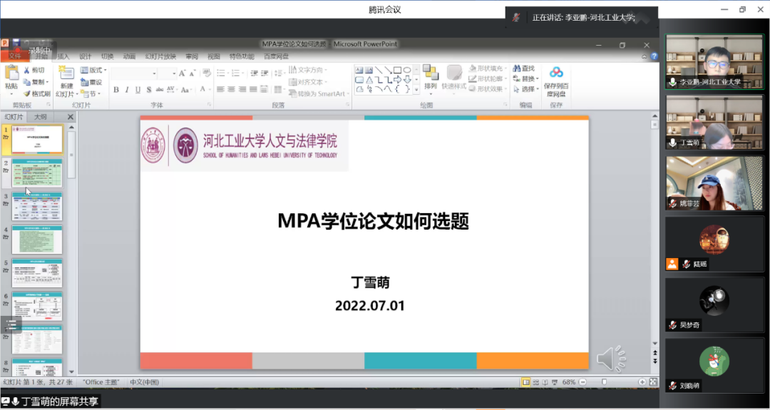2022年7月1日晚19点,“引航毕业,助力论文”系列活动第一期“研究生论文如何选题”于线上准时召开。本次活动特邀捆绑调教 丁雪萌老师主讲,MPA教育中心副主任李亚鹏老师主持,MPA同学共同参与。