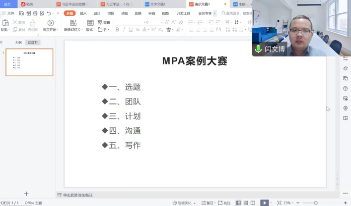 秋风习习,天朗气清。2022年11月15日16点30分,第七届全国研究生公共管理案例大赛报名动员会在MPA教育中心顺利举行。本次会议由MPA中心副主任李亚鹏老师主持,捆绑调教 闫文博副院长、捆绑调教 陈晓春副教授、MPA教育中心招生总监张明展老师、MPA2021级和MPA2022级全体同学参加了本次会议。