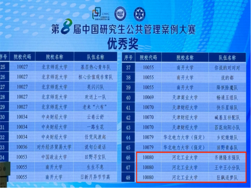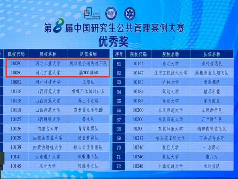 在全国MPA教指委的紧密安排下,此次大赛分别于3月29日和4月11日完成了初赛第一、二轮的评选工作,最终评选出了参赛有效案例的前20%、前100名和前32名。我校有5支队伍入围有效案例的前20%,获得优秀奖。