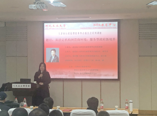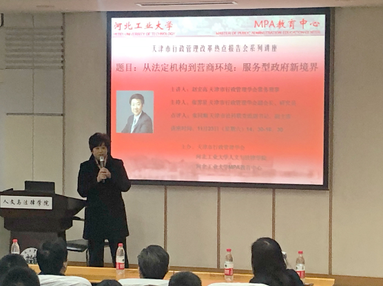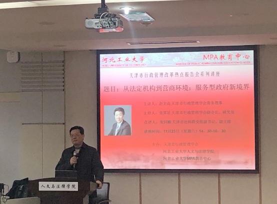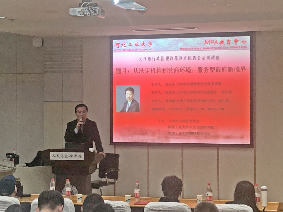 2019年11月23日,捆绑调教 举办第九期“文法大讲堂”。诚邀天津市行政管理学会常务理事,滨海新区经开区法定机构改革小组成员、天津经济技术开发区政务服务中心(行政审批局)书记、局长赵宏高老师主讲以“从法定机构到营商环境:服务型政府新境界”为主题的报告会。讲座由天津市行政管理学会副会长、研究员张霁星老师主持,由天津市社科联党组副书记、副主席张同顺老师进行点评。文法学院师生认真聆听了本次讲座。