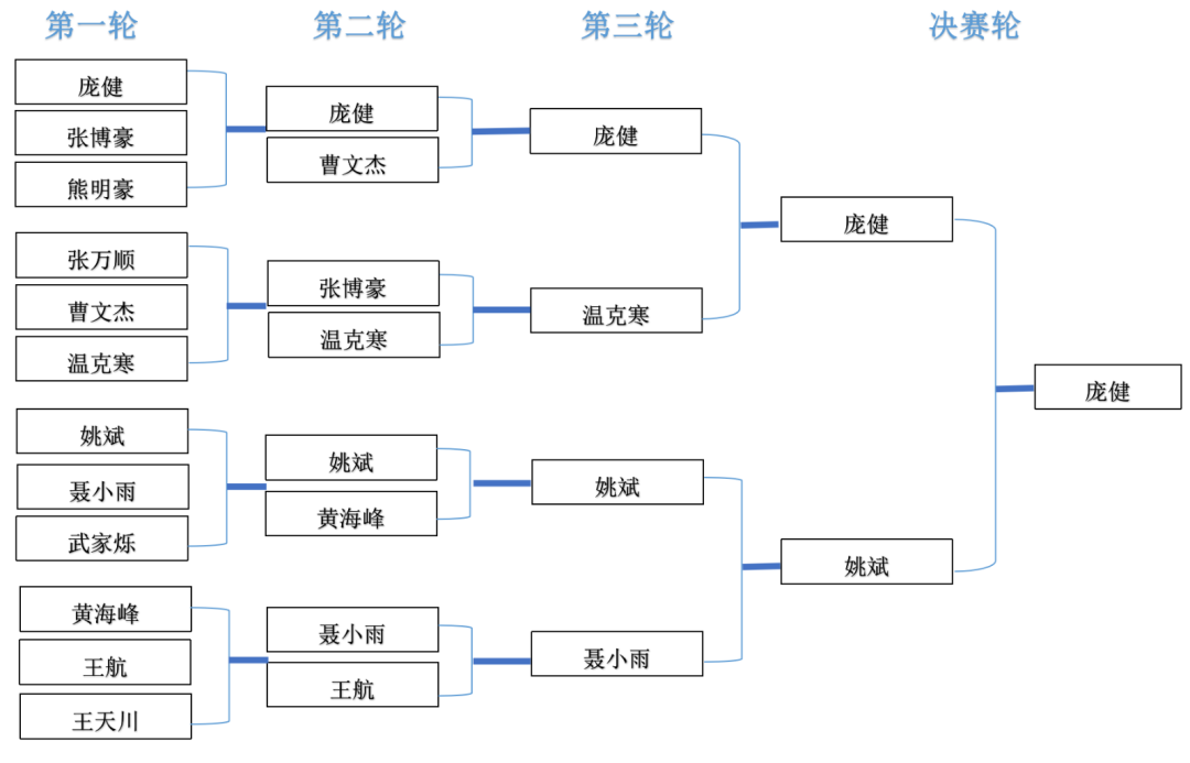 男子组小组赛以单循环对决形式进行,选出前两名进入第二轮。淘汰赛阶段,A组第一PK C组第二,C组第一PK A组第二,以此类推,胜者进入下一轮,最终决出四强,他们分别是姚斌、聂小雨、温克寒、庞健。随后进行4进2 的PK,姚斌VS聂小雨,温克寒VS庞健,最终姚斌和庞健获得胜利,进入决赛争夺冠亚军,聂小雨和温克寒争夺季军。比赛对阵表如下: