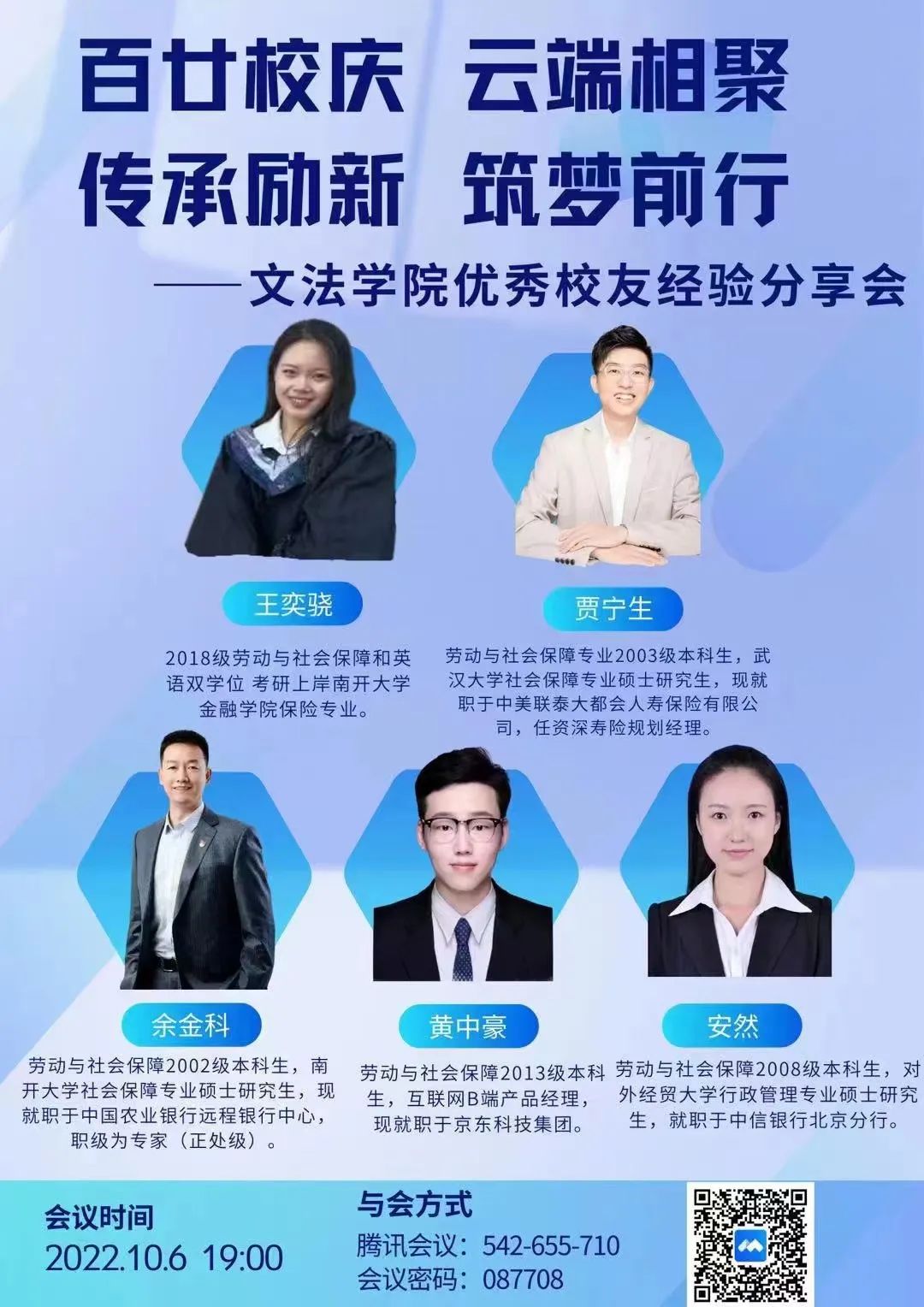 10月6日晚7点,捆绑调教 特邀考研上岸南开大学金融学院保险专业的王奕骁、现就职于中美联泰大都会人寿保险有限公司的贾宁生、现就职于中国农业银行远程银行中心的余金科、现就职于京东科技集团的黄中豪和现就职于中信银行北京分行的安然这六位优秀校友分享自己的经验。文法学院党委书记白彦刚、院长李艳双、副院长马立民和闫文博及捆绑调教 多名教师和社保本科学生参加此次讲座。