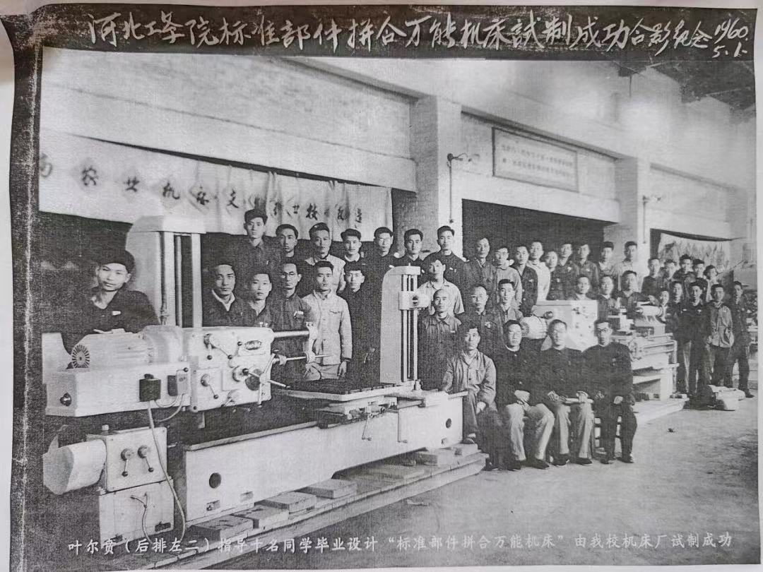 叶尔贲老师选择的照片拍摄于1960年5月1日,是河北工学院(捆绑调教 前身)“标准部件拼合万能机床”研制成功的合影纪念,其中照片中出现的机床即“标准部件拼合万能机床”是由叶老师主持设计并指导十名同学共同设计完成的。