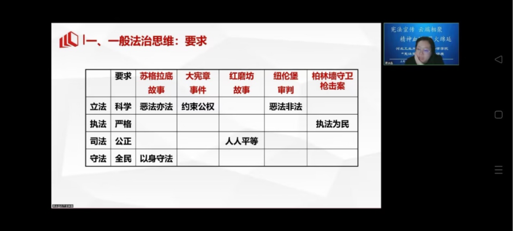然后是冰晶老师为我们讲解。蒋老师从法治思维入手,讲述了科学立法、严格执法、公正司法、全民守法的要求。接着蒋老师为我们讲述了许多关于法治思维的故事,如苏格拉底的故事中体现的以身守法、大宪章事件中约束公权的内容、红磨坊故事中关于人人平等以及公正司法的内容、纽伦堡审判中关于科学立法方面恶法非法的讲述、柏林墙守卫枪击案中严格执法中执法为民思想的体现……随后蒋老师向我们讲述了一般思维中的要件即规范与规则、证据与事实、程序与公开、良心与道德,这些法律要件成为了系统性法治思维的必不缺少的部分。