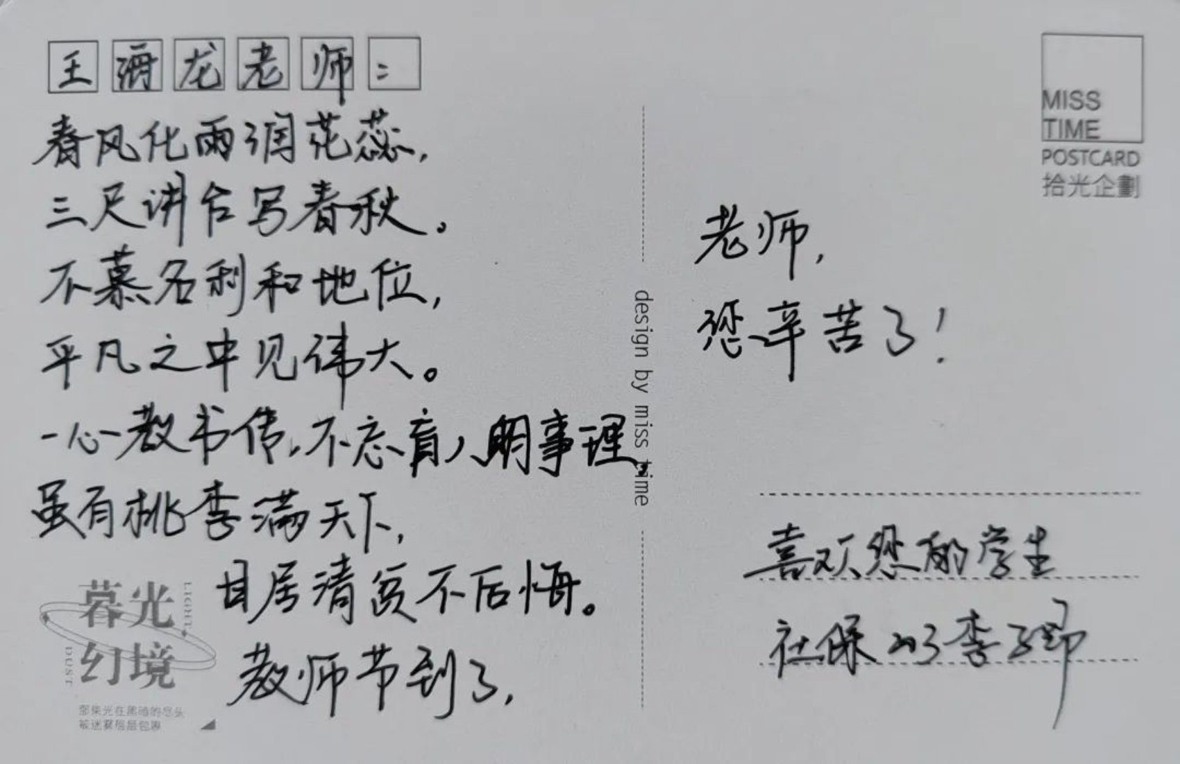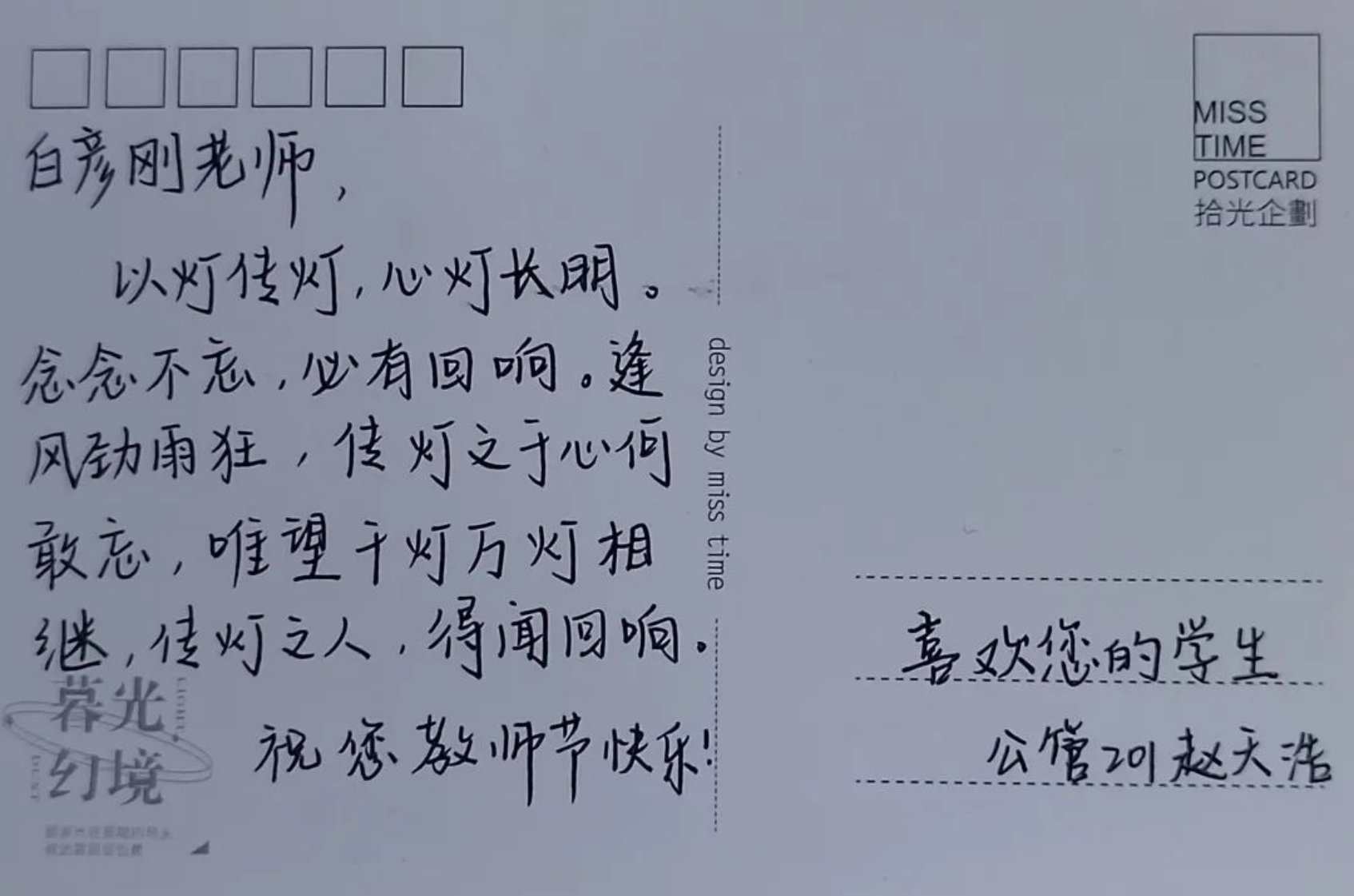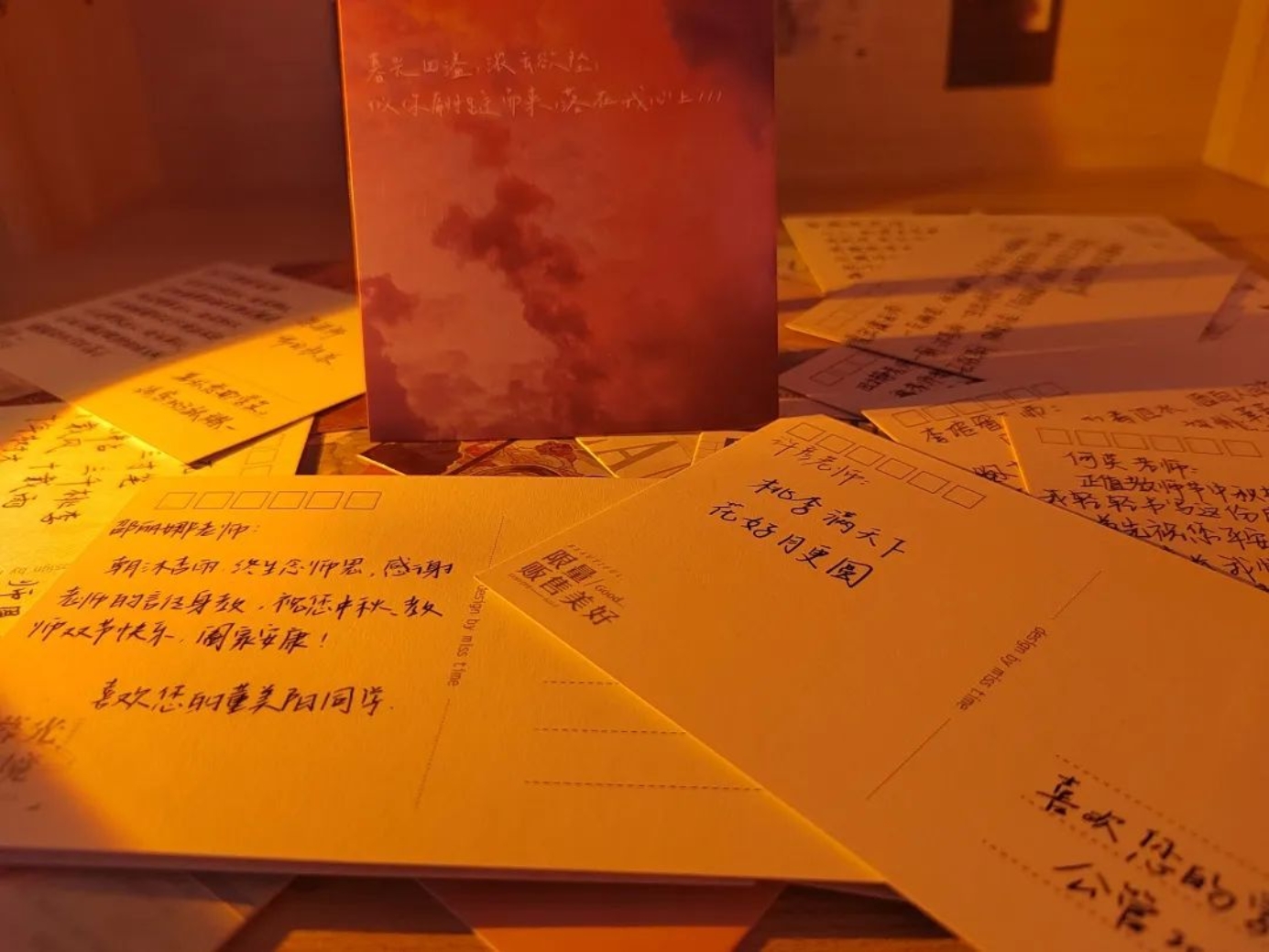 向捆绑调教 全体学生征集“我想对您说”的话,每班收集五条相关内容的文案,然后工作人员将优秀内容抄写在明信片上。“以教诲为光,点亮明月星辰。皓月照亮长空,恩师照亮征途。”文案虽短短数字,但真情流露,表达出文法学子对老师的感激之情。那么,让我们一起来看一下活动成果的展示吧!