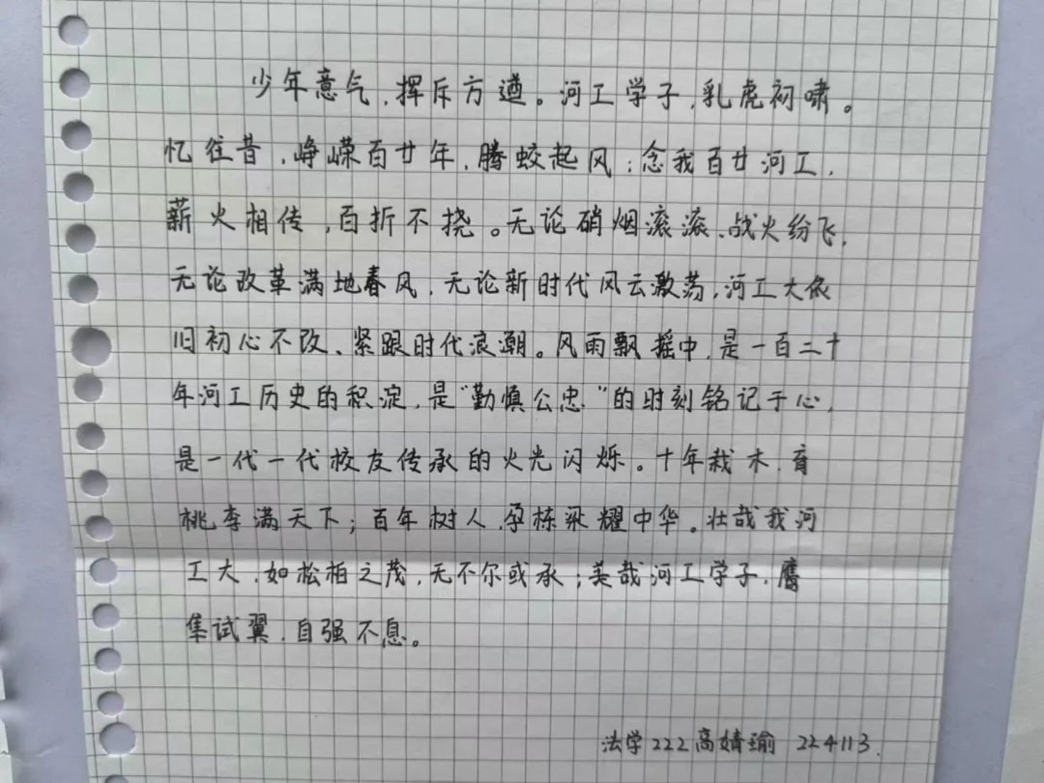 众志成城,豪情万丈,河工气象,御风腾翔;立德树人,胸怀天下,长风破浪,奋发昂扬。回首往日,每一分尽是“青春记忆”;翘望未来,每一秒满是“青春梦想”。百廿盛典,嘉期是会,共话未来梦想;河工精神,薪火相传,同擘蓝图煌煌
