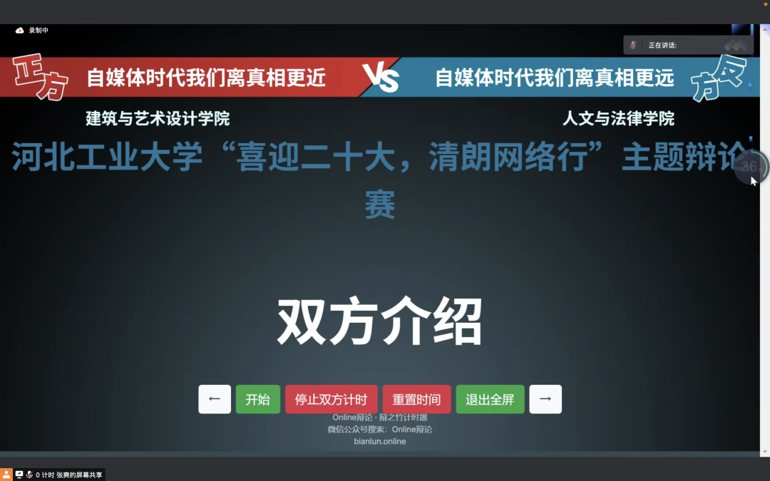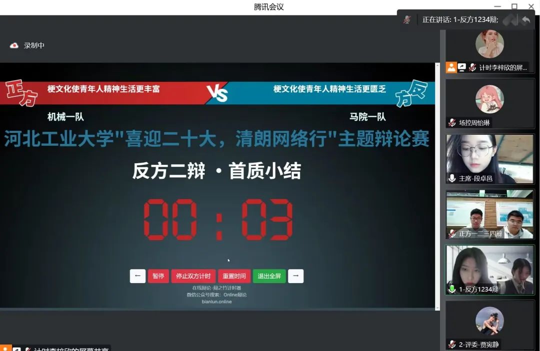 10月16日上午8点30分,捆绑调教 “喜迎二十大,清朗网络行”主题辩论赛第二轮在线上——腾讯会议成功举办。比赛共有3轮,辩手们唇枪舌战,雄辩滔滔。