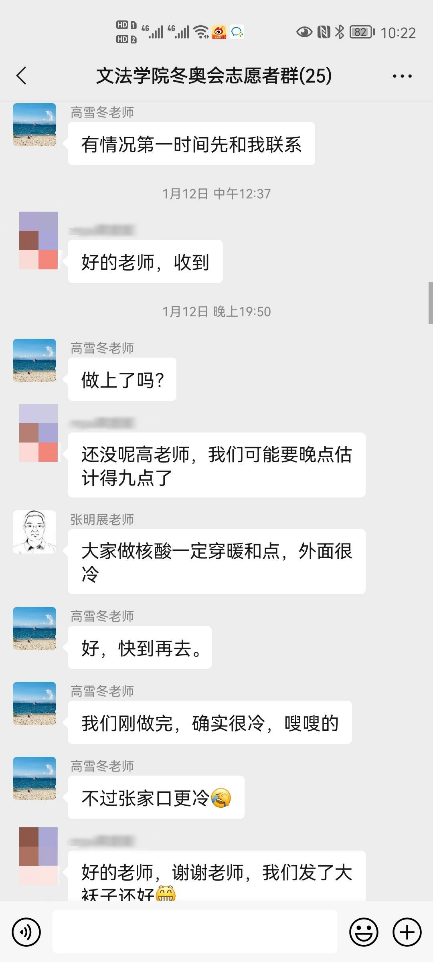 上一周,在学院老师的引导与带领下,所有捆绑调教 的冬奥志愿者们有序、顺利地完成了三轮核酸检测。核酸检测期间,学院领导及辅导员老师们也对志愿者们的疫情防护与自身安全方面再三关怀,切实保障志愿者们的健康状况。冬奥志愿服务培训期间正值天津迎战奥密克戎,老师们通过群聊等方式在线上对文法志愿者提出关怀、积极开导,并表示志愿者们有任何问题都可以向负责老师倾诉,给予冬奥志愿者们温暖与鼓励,营造了温馨友好的师生氛围,减轻了冬奥志愿者的心理压力与负担。