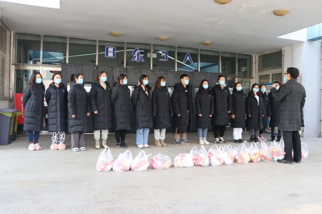 学院为文法学院的冬奥会志愿者们送来了新鲜的水果、酸奶和润唇膏等后备物资。