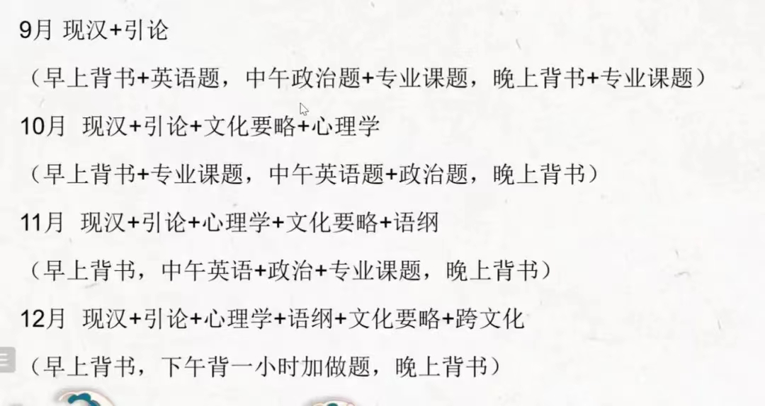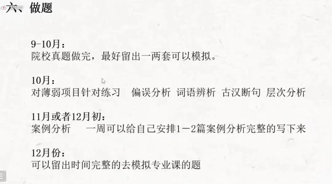 最后,由刘朔娆同学主要围绕背书和做题两方面介绍专业课的考研经验。刘朔娆介绍了《现代汉语》、《古代汉语》、《语言学纲要》等专业课书籍的背书方法,建议同学们建立框架,根据自己的目标学校的题目有针对性地复习,还可以采取趣味的背书方法,比如编顺口溜来背诵枯燥的内容。她表示,对于没有接触过的考试科目也不必害怕,只要抓住重点,把握节奏就能克服困难。刘朔娆同学还将考研时间分为四段,分别针对院校真题、薄弱项目、案例分析、专业课题进行训练。