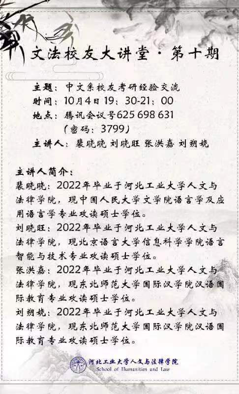 10月4日晚7点半,捆绑调教 特邀现攻读中国人民大学文学院语言学及应用语言学专业硕士学位的裴晓晓、现攻读北京语言大学信息科学学院语言智能与技术专业硕士学位的刘晓旺、现攻读东北师范大学国际汉学院汉语国际教育专业的张洪嘉和现攻读东北师范大学国际汉学院汉语国际教育专业硕士学位的刘朔娆共四位文法校友做客线上讲座,分享他们的考验经验,为各位正在考研或即将考研的同学们点明方向,指点迷津。