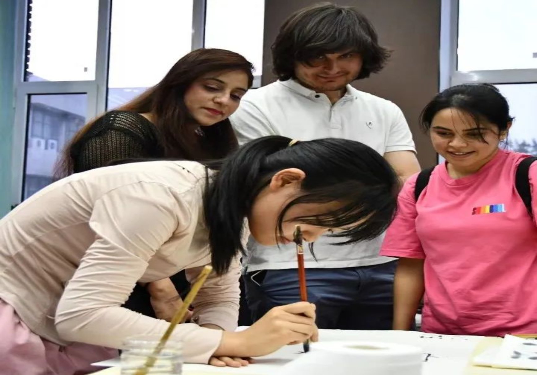 篆刻组的同学们操作着篆刻刀在印石上徐徐切下,往前运行,时提时按,积点成线,大家在篆刻中体会到方寸之间文字与技法的美。国际学院的留学生同学们也来到了活动的现场,亲手体验中华篆刻文化,学习在石头上创作独特的篆刻作品,被中华优秀传统文化深深吸引,兴致盎然地与其他同学一同探讨端午节的习俗,了解源远流长的端午文化。