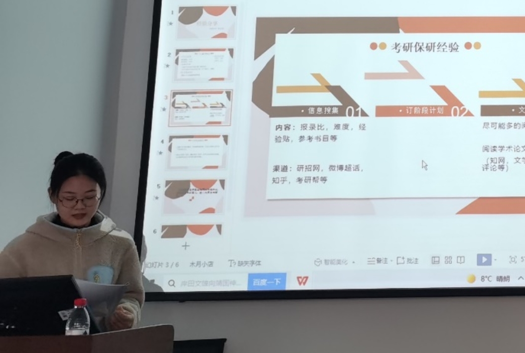 李文洁学姐首先向大家分享了自己的学习经验,介绍了汉语课程的学习方法;纪文馨学姐以自身保经历和心路历程为例,向大家说明了保流程与各个环节的准备与实施;郑金铭学姐和王杨宇迪学姐则着重从现当代文学课程出发,勉励学弟学妹们要精读文学作品、勤读文献期刊、把握学术动态。