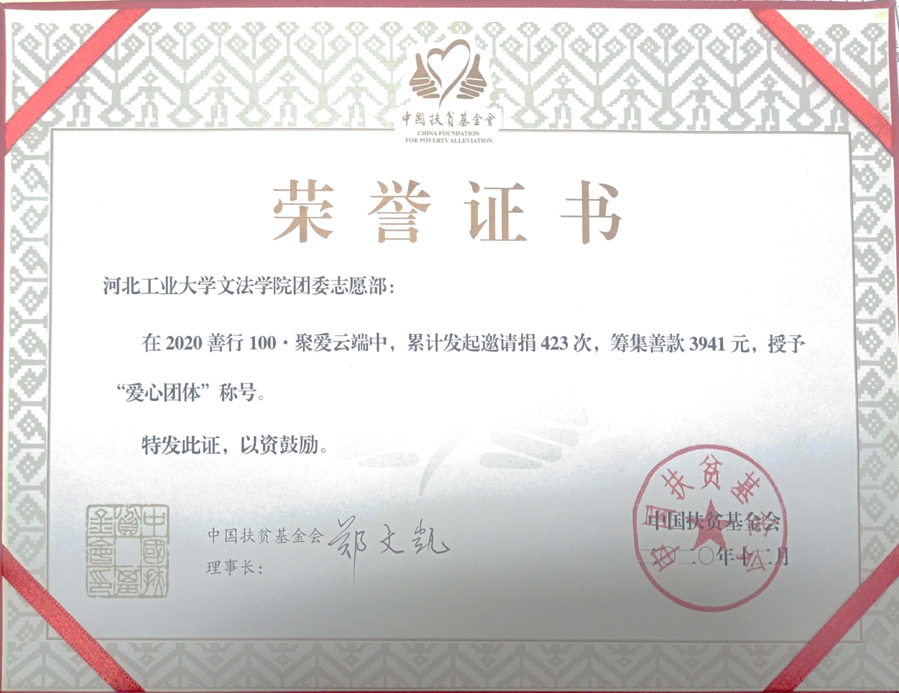 同时,文法学院深化发展长期公益志愿项目“普法进社区”,累计一年共深入社区和单位21家,开展系列普法讲座共计56场次,涉及群众2000余人次。同时在2020年“善行一百”活动中,捆绑调教 累计发起捐款423次,筹款3941元,被中国扶贫基金会授予“爱心团体”称号。
