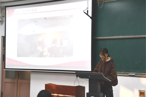 任梓轩同学从四点论述了对大学生进行消防安全教育的原因。她又以日常学生宿舍内的生活为发端,简述学生宿舍不能使用大功率电器的原因以及学生宿舍预防火灾的措施,她着重讲述了宿舍插座的摆放问题,提醒同学们防患于未“燃”。任梓轩同学还讲述了教室安全、图书馆安全以及电动车安全。她以视频播放引导同学们注重电动车的安全问题,包括行驶安全、停放安全和充电安全,令同学们记忆深刻。