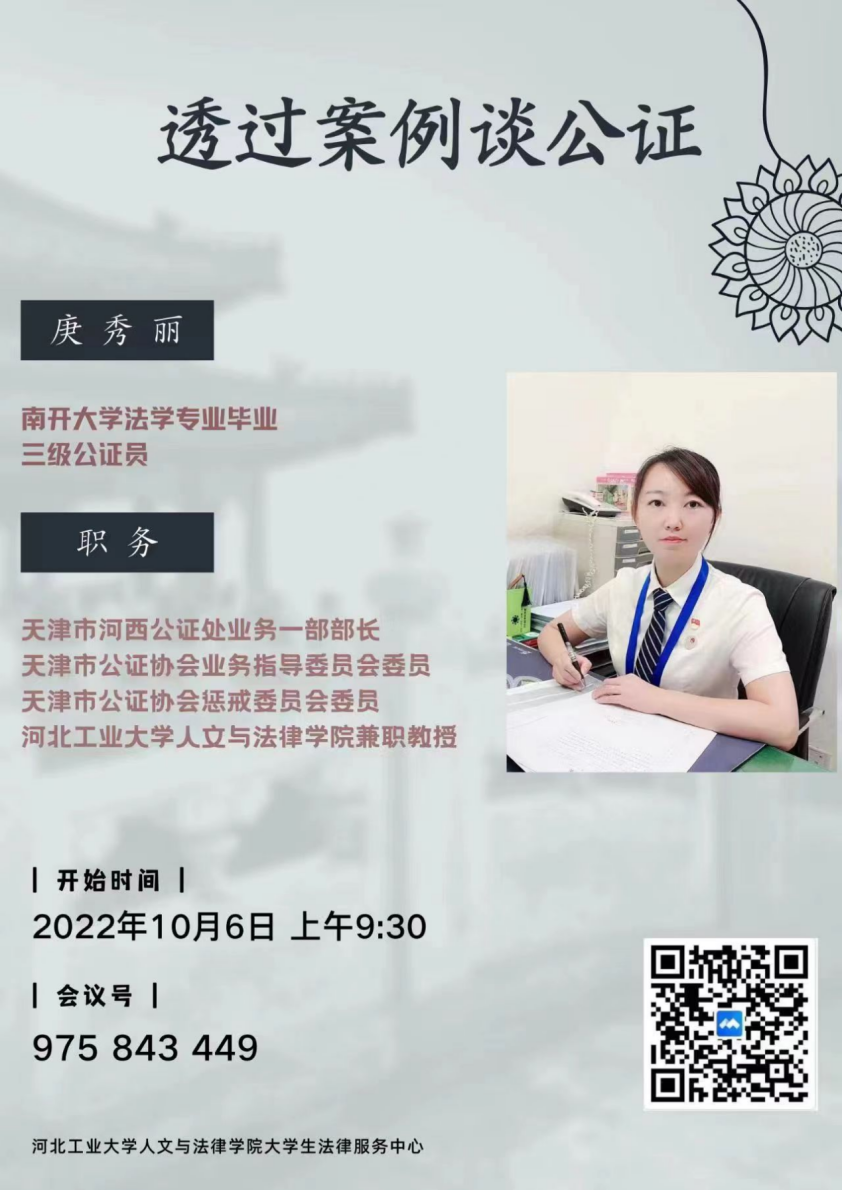 10月6日上午,天津市河西公证处庚秀丽公证员做客文法学院。庚秀丽公证员担任天津市河西公证处业务一部部长、天津市公证协会业务指导委员会委员、天津市公证协会惩戒委员会委员以及捆绑调教 兼职教授,为在校大学生做了题为“透过案例谈公证”的线上讲座,详细讲述关于公证的方方面面。蒋冰晶、李飞等老师和全体法学专业学生参与了本次讲座。