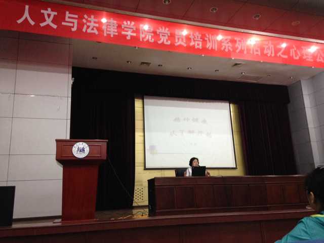 “世界上最浩瀚的是海洋,比海洋更浩瀚的是天空,比天空更浩瀚的是人的心灵。”心理健康对我们的学习和生活起着不可替代的重要作用, 2015年10月16日下午两点,捆绑调教 党员培训系列活动之心理公益讲座在行政楼一楼报告厅举行。本次心理讲座由刘茹教授主讲、文法学院2014级党支部书记孙倩茹老师主持,我校心理健康中心的老师、各学院心理辅导员、心理委员及文法学院2014级所有入党申请人参加了此次讲座。刘茹老师是天津第一中心医院心理科主任医师,多年从事心理健康教育和研究,具有丰富的临床经验。本次讲座的主题是“精神健康从了解开始”,她首先向我们说明了什么是健康,即躯体的、心理的、社会的完满状态,随后深入浅出地阐述了心理健康的重要性,强调心理健康与大学生的成就、贡献、成才关系重大,是大学生走入社会的基本要求。针对校园危机事件时有发生的现状,刘老师详细讲述了校园心理问题的成因、相关因素分析以及在心理咨询方面应当注意的问题。针对大学生经常会面对来自各方面的压力,刘老师带大家了解压力,传授有氧运动、冥想等管理压力行之有效的方法。会后刘老师为各院心理委员答疑解惑,让在场老师都受益匪浅,赢得阵阵掌声。