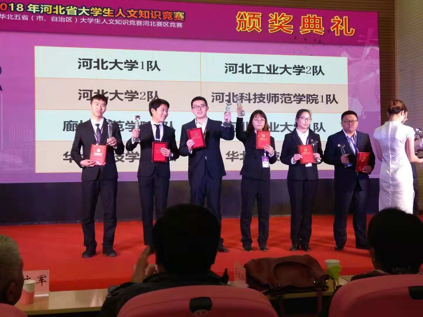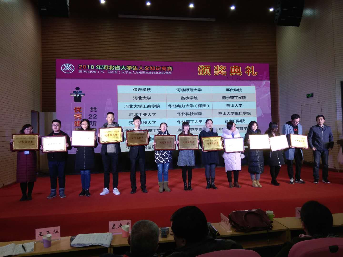 12月7日至10日,由我校捆绑调教 、马克思主义学院、外国语学院十名学生组成的2支代表队赴石家庄参加河北省教育厅主办,河北师范大学承办的华北五省(市、自治区)人文知识竞赛河北省赛区比赛。经过激烈角逐,我校2支代表队均获省级一等奖,我校获得优秀组织奖,4位指导老师获得优秀指导教师。河北省教育厅高教处副调研员高明、河北师大副校长郑振峰、河北师大教务处处长郭毅等领导莅临现场观看比赛并为获奖师生颁奖。华北五省人文知识竞赛是由清华大学于2000年发起,由五省相关教育部门负责的一项重大赛事。它是跨省域的大型学科竞赛,具有广泛的影响力。河北省大学生人文知识竞赛是华北五省人文知识竞赛的省际选拔赛,是河北省教育厅努力打造的多个重要赛事之一,主要有必答题、抢答题、情景展示、即兴说理、诗歌创作以及人文演绎等形式,旨在推动我省各高校的大学文化建设,推进大学生人文素养和创新精神的养成教育,全面提升人才培养质量。各环节比赛充分展示了参赛选手广博的文化知识和深厚的文化修养,呈现了一场精彩纷呈的人文视听盛宴。本次比赛共有41所高校78支代表队参加,我校2支代表队分别以初赛第2名和第8名的好成绩进入半决赛,并均以小组第3名挺进决赛,最终双双获得省级一等奖。