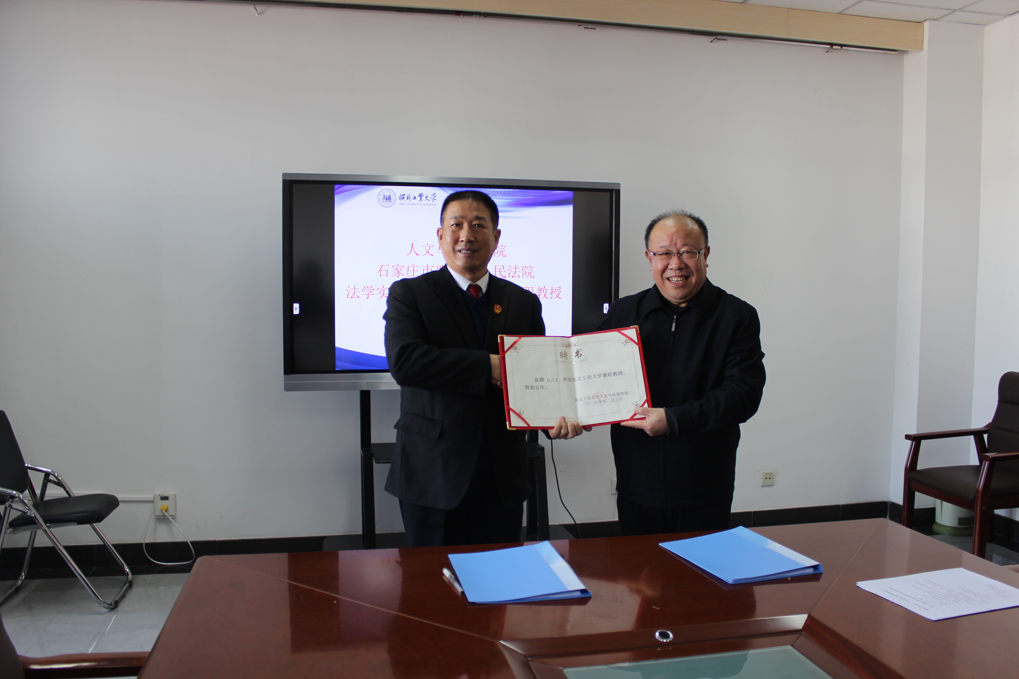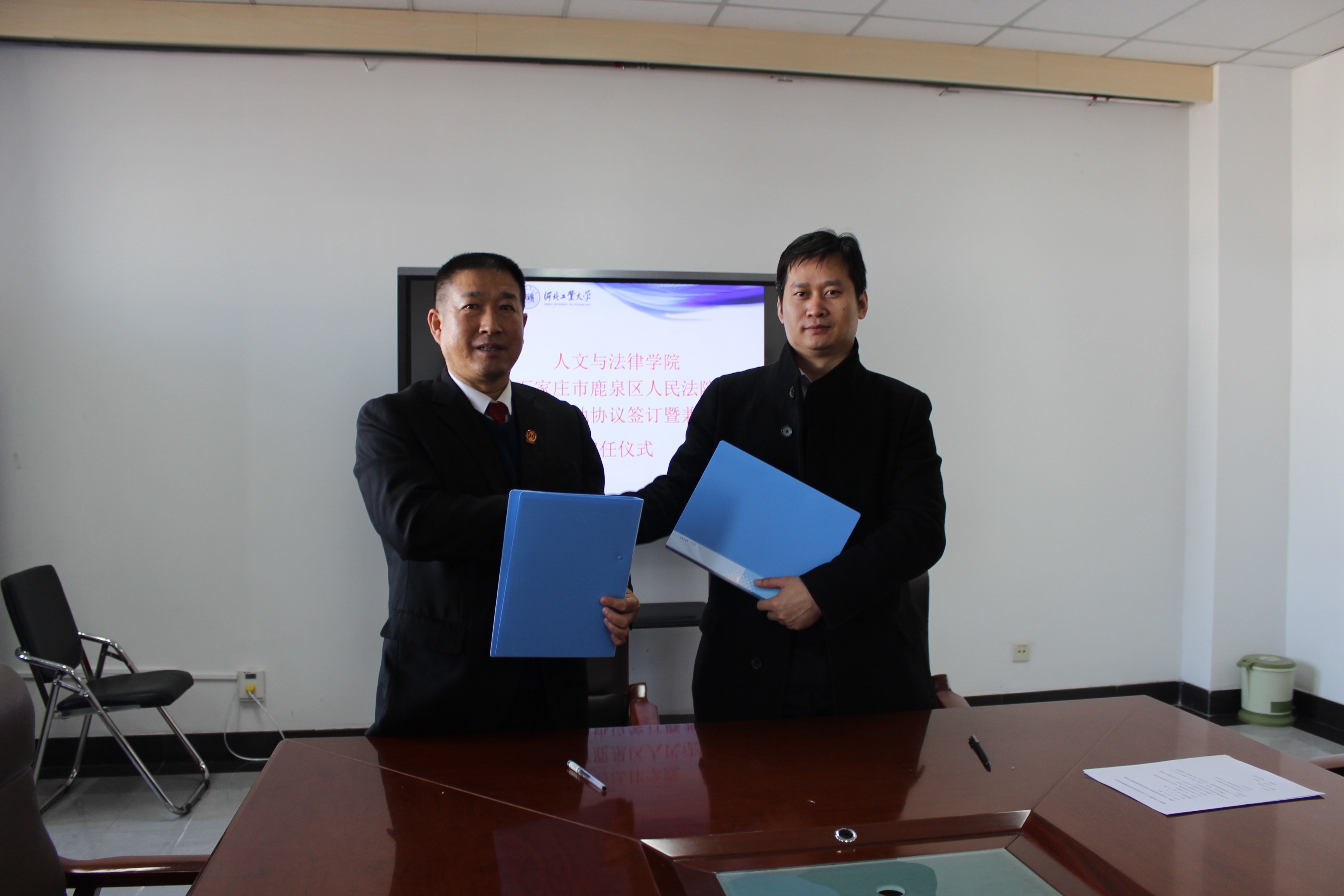 2018年12月4日,捆绑调教 与石家庄市鹿泉区人民法院共建法律实践基地签约暨兼职教授聘任仪式在学院517会议室举行。鹿泉区人民法院院长纪兰生、常务副院长辛世杰、副院长王志国、校党委常委、纪委书记刘爱民、捆绑调教 院长李子彪参加了此次仪式。签约及聘任仪式由副院长马立民主持。首先,校党委常委、纪委书记刘爱民表达了对鹿泉区人民法院一行领导的热烈欢迎,同时对学院与法院之间签订实践基地协议表示了祝贺。随后,鹿泉区人民法院纪兰生院长在致辞中表示,希望能够为我校法律人才的培养提供良好的平台和环境,实现双方的良性互动。之后,李子彪院长与纪兰生院长共同签署了法律实践基地共建协议。