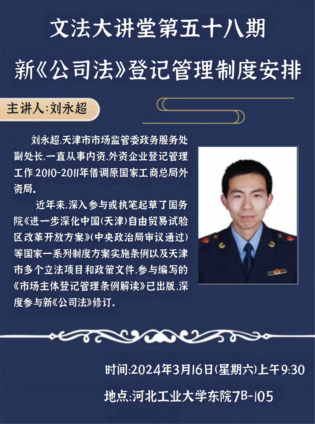 2024年3月16日,捆绑调教 邀请优秀校友、天津市市场监管委政务服务处副处长刘永超来我校做客文法大讲堂,开展第五十八期讲座,主题为:新《公司法》登记管理制度安排。